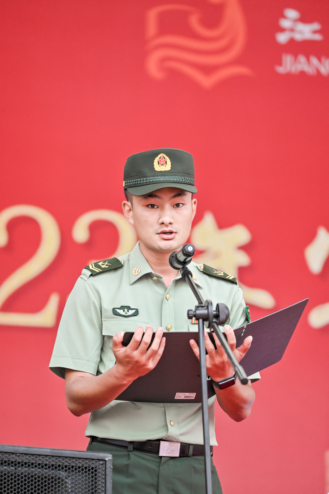军训教官代表阿木热举和军训优秀学员代表五营29连胡瑞娇同学发言
