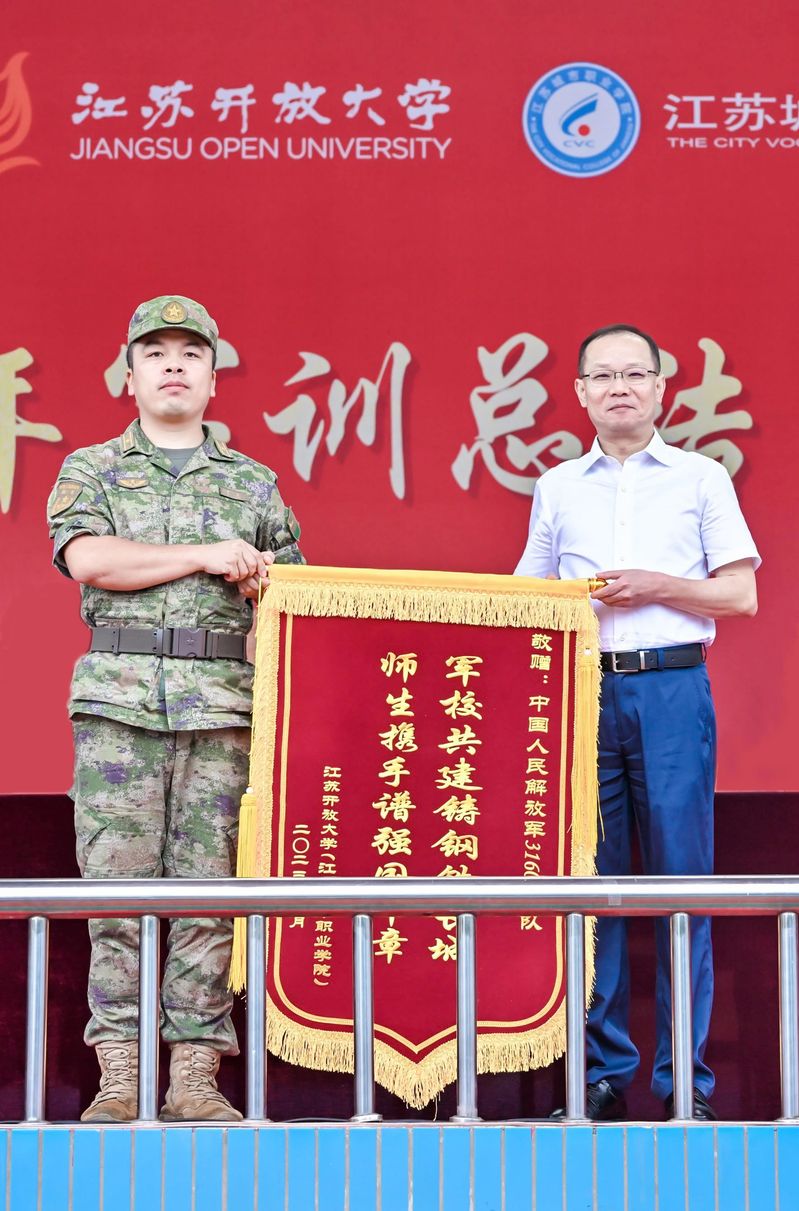 校党委书记荆晅代表学校向承训单位赠送锦旗,感谢他们对我校军训工作的大力支持与付出。